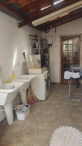 Área externa com lavanderia coberta, quarto e banheiro. Quintal grande.