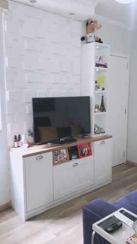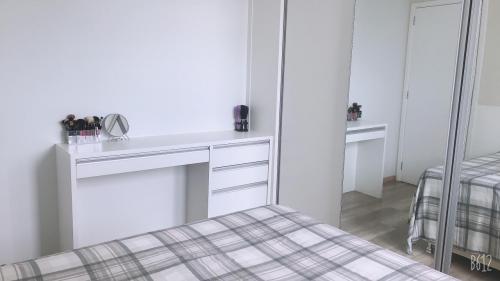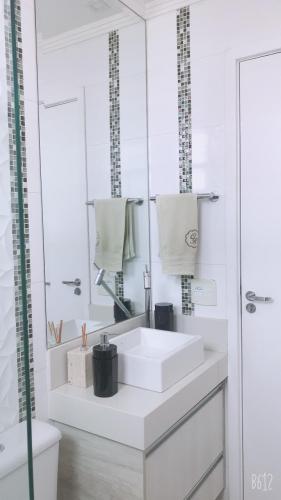 2 dormitórios (sendo 1 com guarda-roupas planejado e bancada de maquiagem, sala 2 ambientes, cozinha planejada cm filtro embutido, banheiro social com box e espelho, área serviço e 1 vaga de garagem coberta.