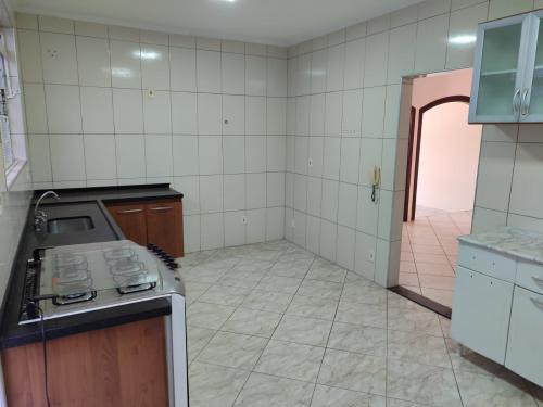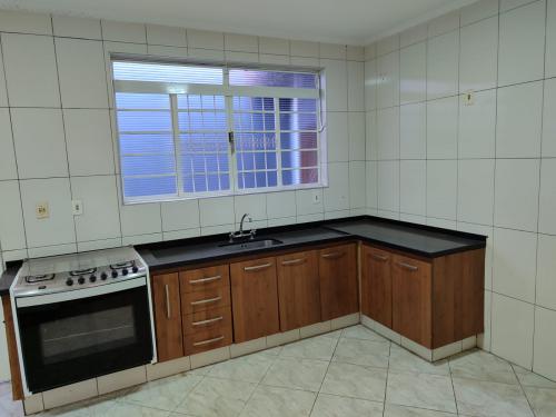 Casa de tijolinho à vista com cômodos amplos e cozinha com armários planejados.